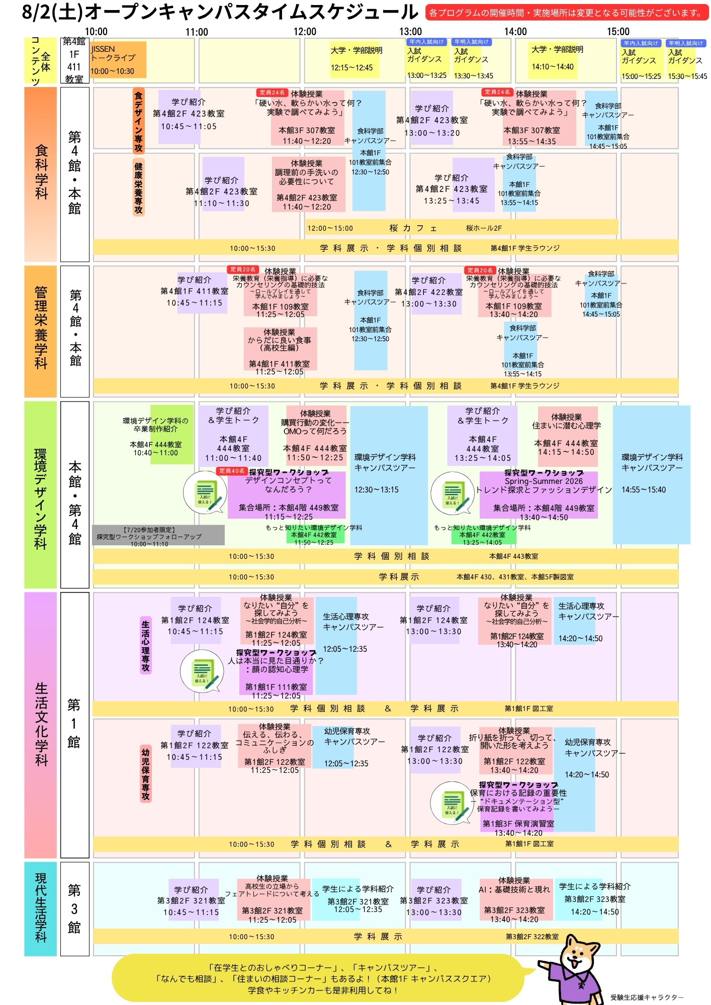 ※食デザイン専攻、健康栄養専攻、環境デザイン学科は開催時間が異なります。プログラムをご確認ください。